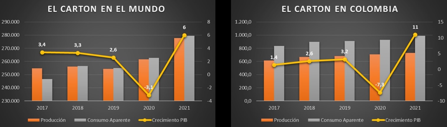 Gráfico 1: producción y consumo de cartón en el mundo y en Colombia, evidenciando que el aumento de la demanda impacta positivamente el comportamiento económico (PIB). Fuente: RISI y Banco Mundial.